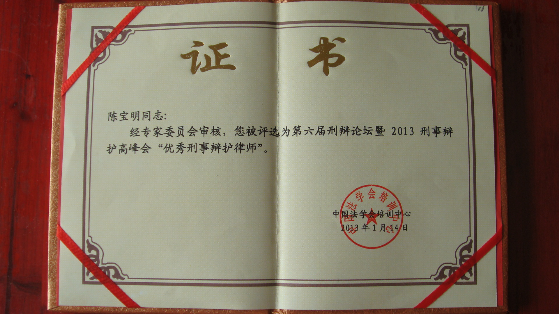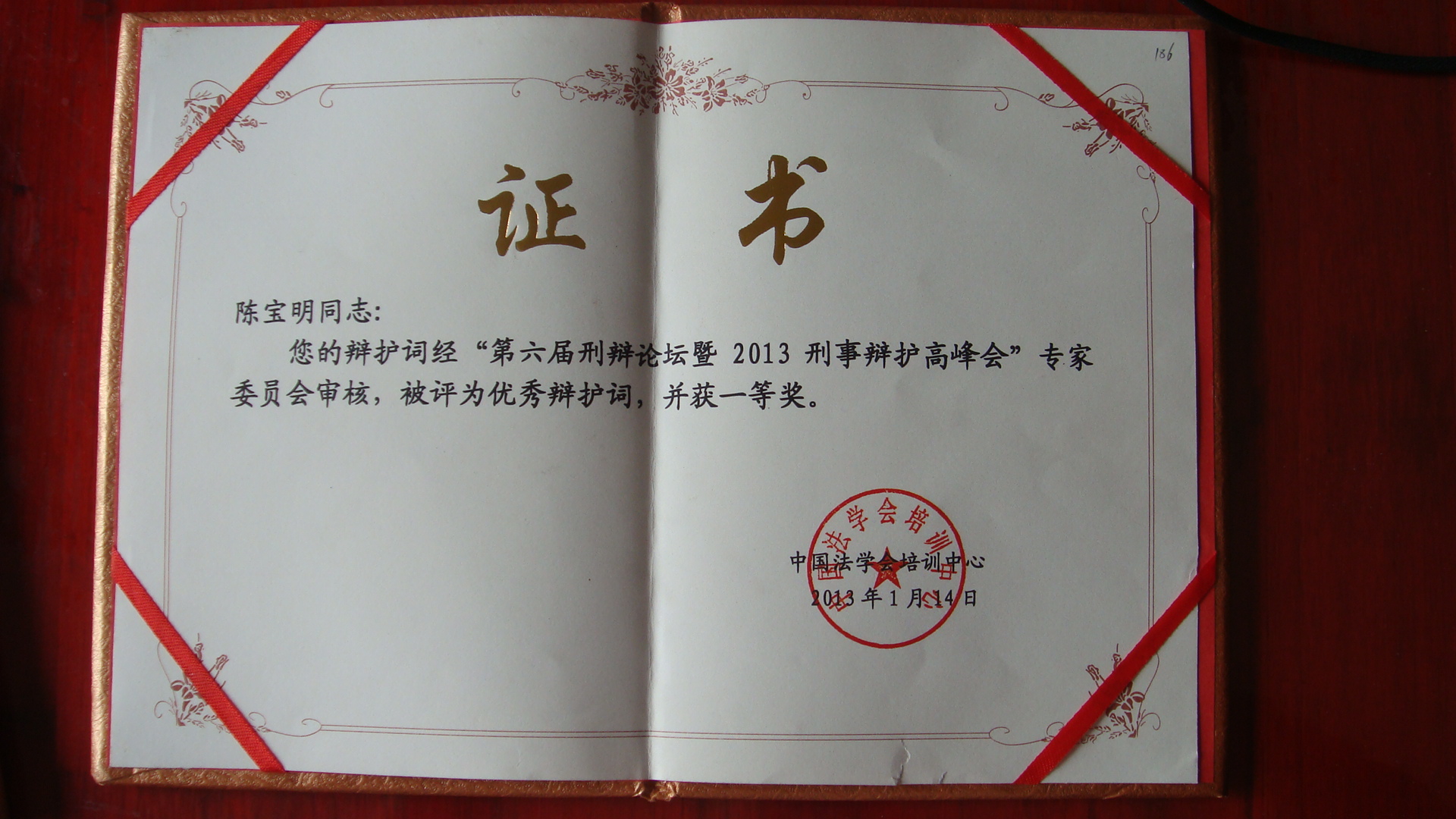 在全国“第六届刑辩论坛暨2013刑事辩护高峰会”上,我所主任陈律师的辩护词荣获“优秀辩护词,并获得一等奖”,陈律师同时荣获“优秀刑事辩护律师”奖。